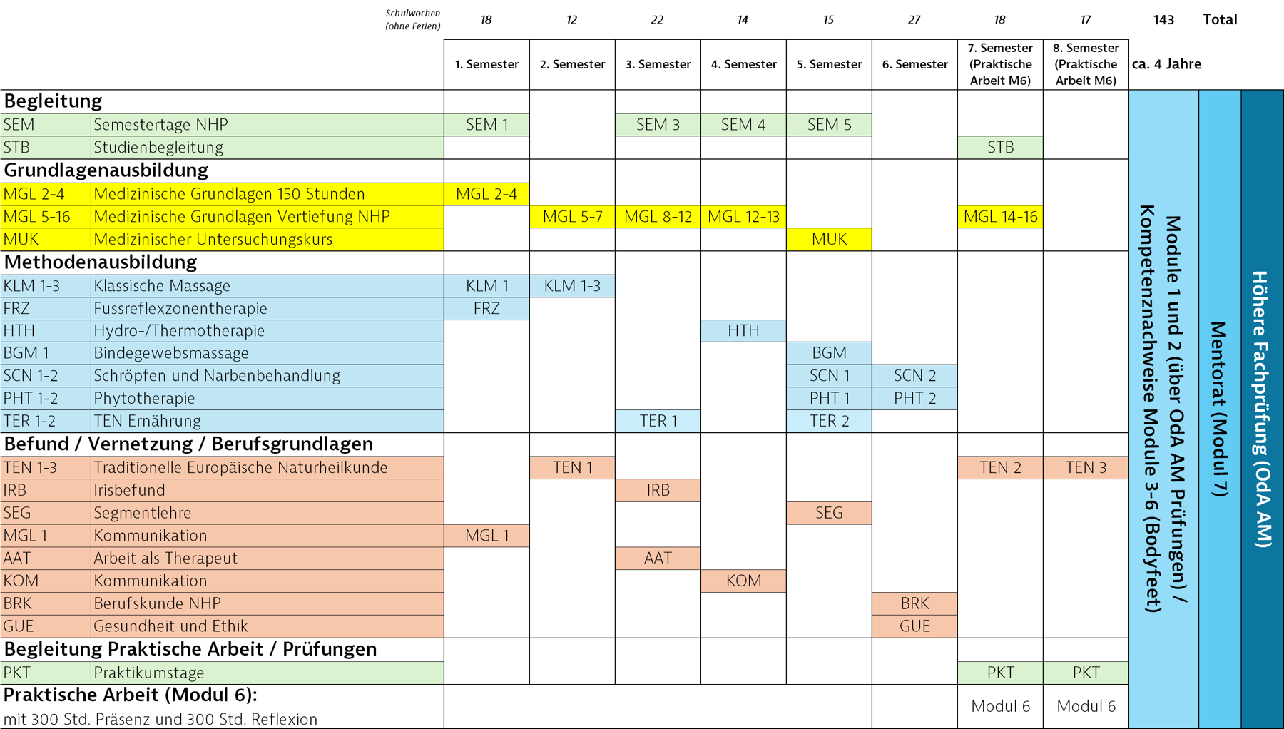M3 Gesundheit und Ethik (GUE)Bewusst mit besonderen Herausforderungen und Belastungen umzugehen und demzufolge fachkompetent zu handeln, ist nicht immer einfach. Das Wissen über die allgemeine Gesundheitsförderung, Einflussfaktoren, Gesundheitsmodelle, berufsethische Grundsätze, als auch das Erkennen von Grenzen und Möglichkeiten sowie der Psychohygiene ist wesentlich für jeden Therapeuten und wird in diesem Modul anschaulich vermittelt. Dieser Modulabschluss wird durch die Bodyfeet nach Abschluss des Moduls gemäss Vorgaben der OdA AM organisiert und durchgeführt. |