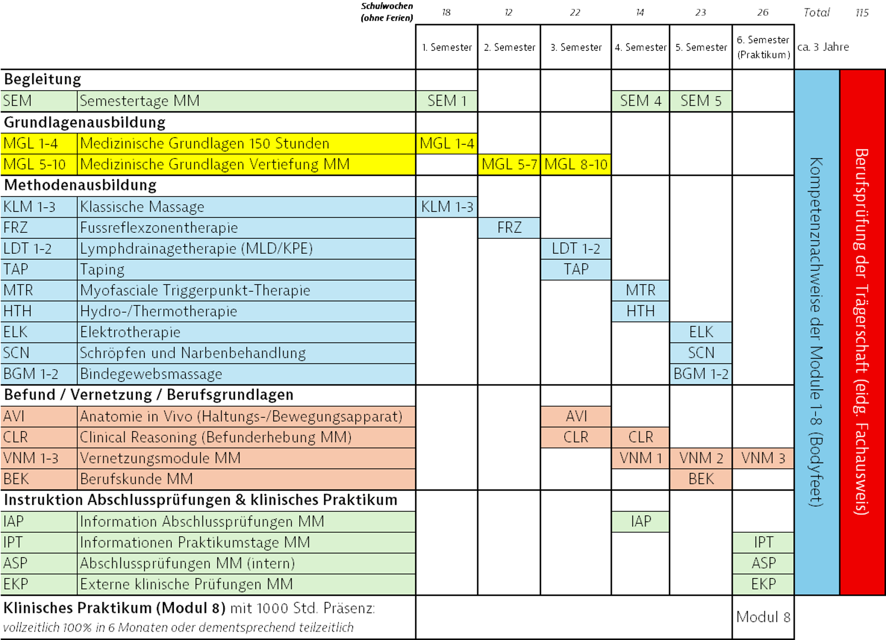 Das Fundament der Ausbildung bilden die physikalischen Verfahren (Klassische Massage, Fussreflexzonentherapie, Lymphdrainage-Therapie, Bindegewebsmassage, Myofasziale Triggerpunkt-Therapie, Hydro-/Thermotherapie und Elektrotherapie).